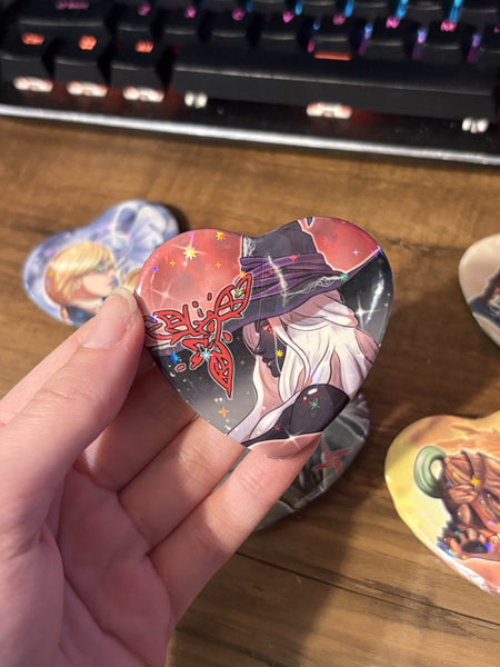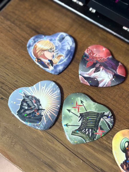 All of the available player character options! And if more DLC ever releases, you bet those characters will be added too. 2.25in holographic buttons!