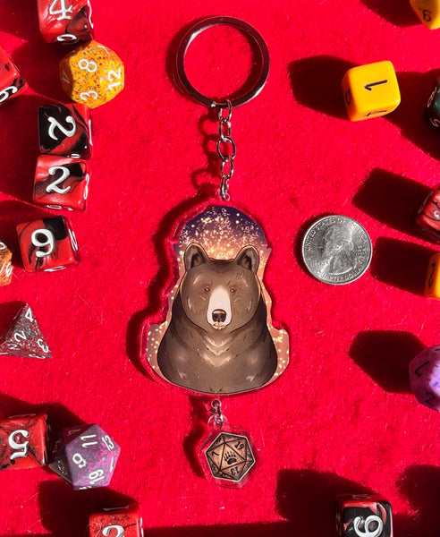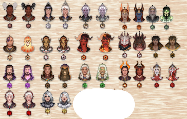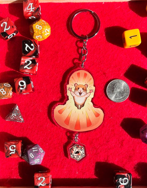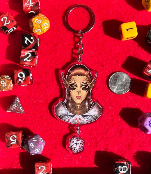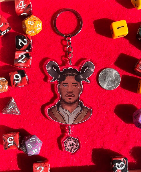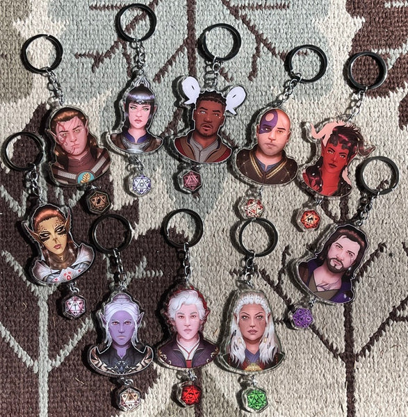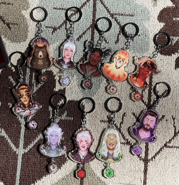 All keychains are double sided and have a different version of the character on the front and back. The symbol on the d20 also changes
